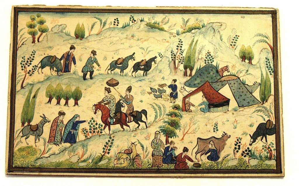A beautifully detailed Persian miniature painting depicting a rural nomadic scene with figures, horses, tents, and a mountainous landscape.