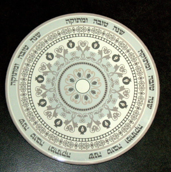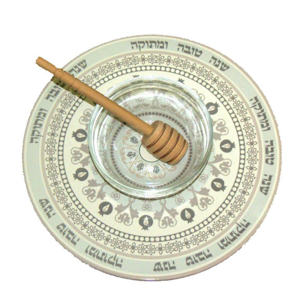 Judaica Rosh Hashanah Ceramic Plate Glass Honey Dish Set Wooden Stick Gray
