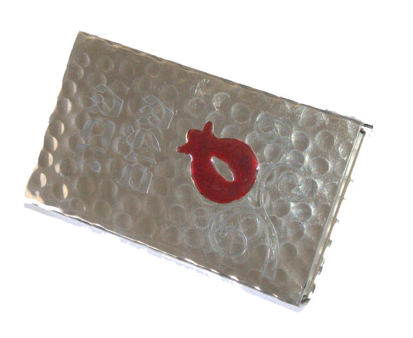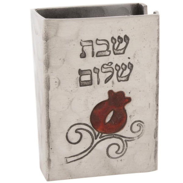 Made from hammered aluminum and decorated with a red pomegranate and the Hebrew writing Shabbat Shalom.